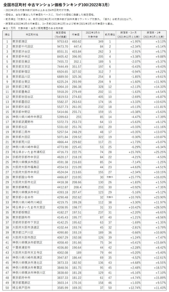 ・100位以内の市区で、前年(2021年3月)と比較して価格が上昇したのは92市区。また、3ヶ月前(2021年12月)と比較して価格が上昇したのは64市区。