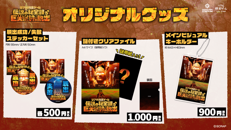 全世界で累計1,490万人以上を動員しているリアル脱出ゲームを企画制作する株式会社SCRAP(本社:東京都渋谷区、代表:加藤隆生)は、株式会社よみうりランドと共催で、ジャイアンツタウン スタジアム(東京都稲城市)にて開催する『伝説の秘宝眠る巨大遺跡からの脱出』のオリジナルグッズを発表いたします。