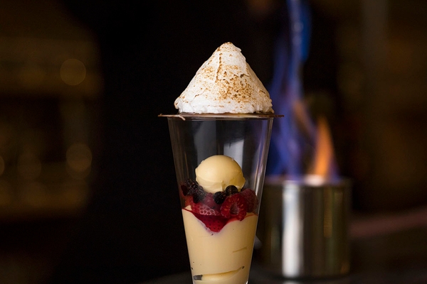 照明を落とした店内に煌めく炎が映える「パフェ・ド・アラスカ」。グラスにカスタード、ベリーソース、アイスクリームを重ね、チョコレートプレートとメレゲで蓋をしました。カルヴァドスの芳醇な香りが引き立つパフェとともに、甘く幸せな時間をお楽しみください。
