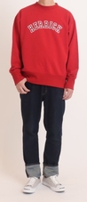 赤の裏毛トレーナーにデニムパンツとスニーカーを合わせた王道のアメリカンカジュアルスタイル。「HERRICK(ヘリック)」はハンプトンズにある公園の名前です。