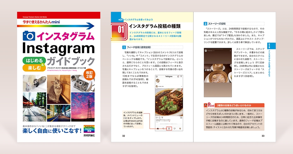 「いいね!」が集まる写真の撮影テクニックや「ハッシュタグ」の効果的な使い方など、具体的な事例を交えながらご紹介する豊富な投稿ノウハウは現在のトレンドに合わせて刷新、さらに初版にはなかった「ストーリーズ」に関する章が新たに追加され、個人ユーザーのみならずInstagramをマーケティングに活用する企業担当者様にもご活用いただける一冊となっています。