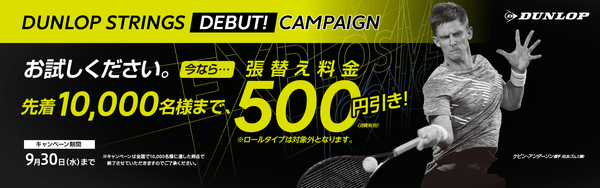 キャンペーン参加店※にて、対象のダンロップのストリングをご購入いただいたお客様の張り替え工賃のうち、500円分(税別)を割引きします。