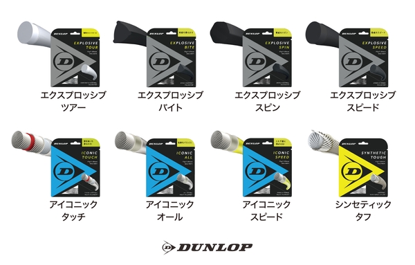 ダンロップのストリングは、ポリエステルの「エクスプロッシブ」シリーズ4種類、ナイロンマルチフィラメントの「アイコニック」シリーズ3種類、ナイロンモノフィラメント1種類の合計8種類のラインアップです。当社は、ストリングが打ち出す「軌道」に着目。プレーヤーの打球軌道に合ったストリングを選ぶことで、強力な武器になると考えています。