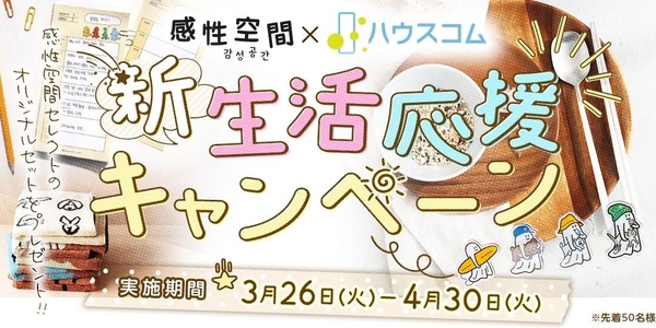 リアル拠点と不動産DXのシナジーでライフスタイルデザインを追求するハウスコム株式会社〔所在地:東京都港区 代表取締役社長執行役員:田村 穂、スタンダード市場 コード番号:3275、以下ハウスコムグループ〕は、この春から新しい住まいで新生活をスタートさせる単身者の方々を応援するため、ハウスコムグループの従業員が発案したアイデアをもとに大阪府にある韓国雑貨セレクトショップ「感性空間」とタイアップし、先着50名に感性空間のオリジナルセットをプレゼントするキャンペーンを実施します。(https://www.housecom.jp/campaign/kanseikukan/)