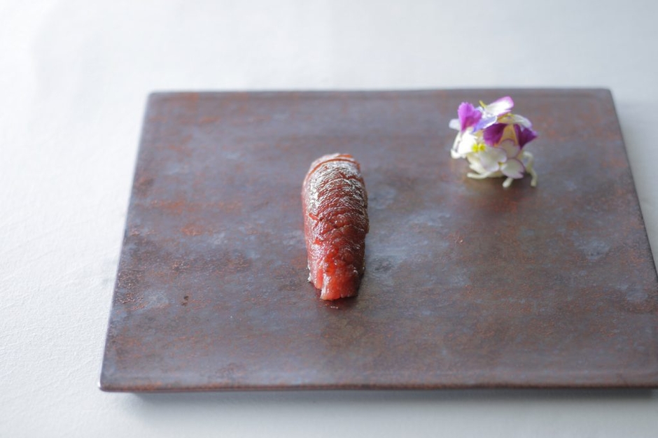 冷前菜のメイン食材は、青森らしいマグロです。青森県で水揚げされるマグロは、初競りでもおなじみの「大間のマグロ」をはじめとする天然の本マグロです。(*1)この春提供する冷前菜は、そんな青森を誇るマグロを使用し、一見「寿司」に見えますが、味わい、香りはまったく異なるSonoreならではの一皿です。見た目はシンプルですが、切り身の表面には黒ニンニクを合わせたマグロの魚醤を塗り上げ、血合いを使用したムースを包み、余すことなくマグロを使用しています。付け合わせには根セロリのピクルスを合わせ、口の中で変化する食感と味は、レストラン名である「Sonore」(*2)のように、朗々と響きあいます。