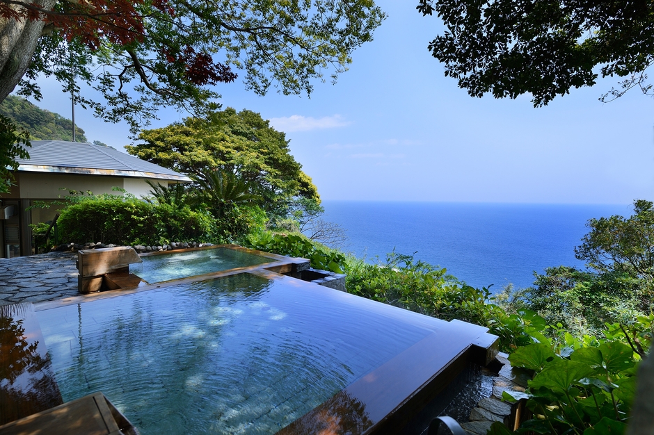 豊富な湯量を誇る2本の自家源泉かけ流しの湯は、館内の7ケ所と姉妹館「つるや吉祥亭」の温泉大浴場やジェットバス、貸切風呂、足湯、波打ち際の公共露天「黒根岩呂」と合わせて、18の湯処にてご満喫いただけます。