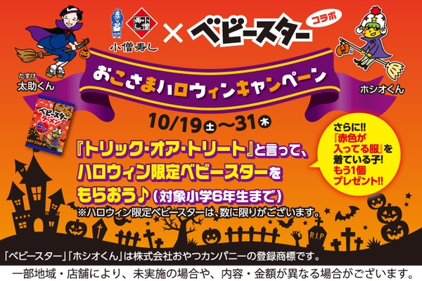 この夏に開催の「夏休みの宿題」キャンペーンをきっかけに仲良くなった、ベビースターラーメンキャラクター「ホシオくん」と小僧寿し公式キャラクター「太助くん」によるハロウィンキャンペーン! 合言葉「トリック・オア・トリート」でハロウィン限定ベビースターをプレゼント!