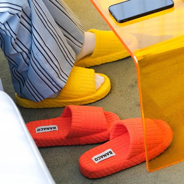 素足に馴染むポップなスリッパが、何気ない日常に遊び心を添える。