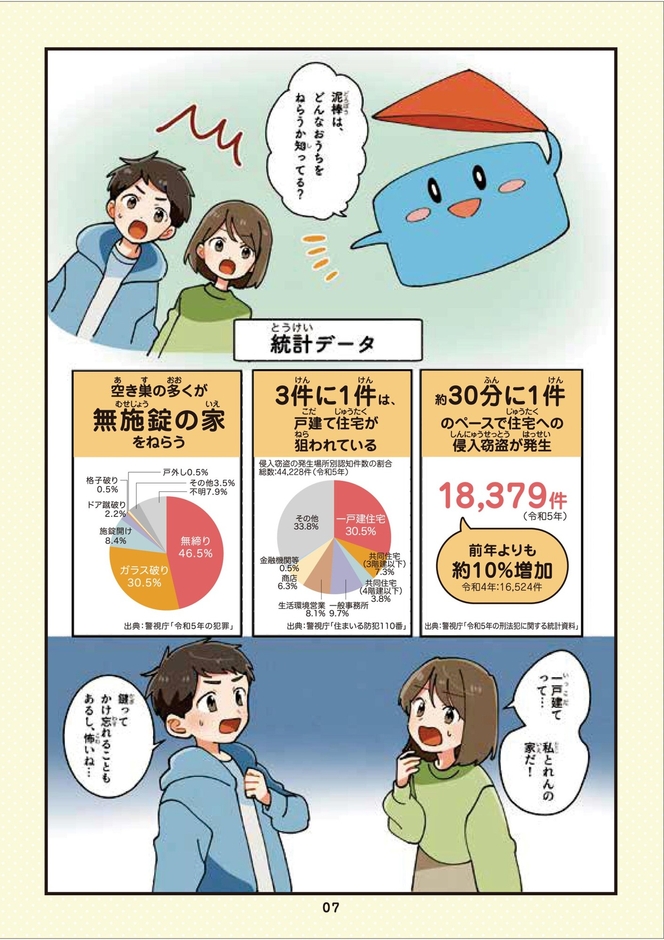 内容:防犯意識のある家・ない家を比較しながら、防犯設備や注意点を物語形式で学べる構成