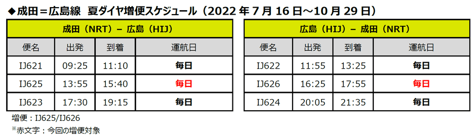 ◆成田=広島線 夏ダイヤ増便スケジュール(2022年7月16日~10月29日)