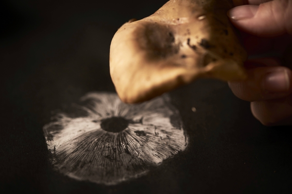 また、普段肉眼では見えにくい微小な胞子(*2)もきのこを鑑定するのに重要な情報源です。その胞子を観察するため、「胞子紋の採取」を実施します。胞子紋はきのこを黒い紙に一晩ほど置いてできた胞子の模様のことです。胞子紋からは、胞子の色、大きさ、飛ばし方、傘の裏の形などの特徴が分かります。観察後は、採取した胞子紋を加工し、花火のように放射状に広がる美しい胞子紋を記念カードとして持ち帰ることができます。