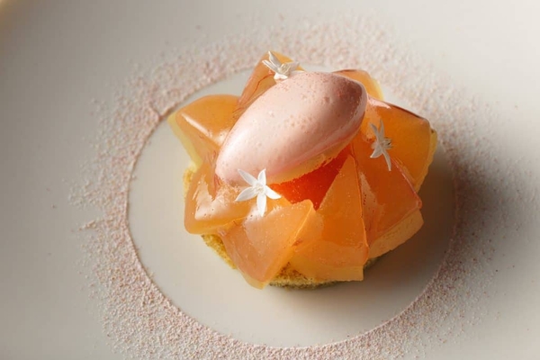果肉から皮まで種以外すべて使用した、上品な香りの桃をまるごと楽しめる一皿です。ヴェルヴェーヌと白ワインで真空コンポートした果肉とミルクアイスを、桃の葉を混ぜ込んだジェノワーズの上にのせ、ハイビスカスのジュレを被せています。ミルクアイスは、軽やかな酸味が特徴のレ・リボというフランスブルターニュ地方の伝統的な発酵乳製品と濃厚なミルクをあわせ、桃の香りが引き立つように、上品な甘さに仕上げています。
