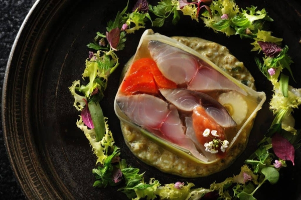 フルーティーな酸味と爽やかさを加えるために、フランボワーズビネガーで締めた鯖を夏野菜とトマトジュレでテリーヌにしました。トマトから抽出した透明なエキスに塩分を抑えた煎り酒(純米酒に梅干しとかつお節を入れ、煮立てて濾したもの)を入れることで、鯖の風味を引き立てます。テリーヌの下に引いたラビゴットソースには、触感のアクセントとして胡瓜の角切りと、ミネラルを含んだ旨味を持つ昆布を加えています。ロゼワインで煮込んだ梅肉を添えることで、さっぱりと味わえる一皿です。