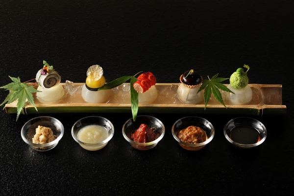 五味(酸・塩・辛・苦・甘)をそれぞれ小さな料理に詰め込み、繊細な技術で表現した星のや東京総料理長 浜田 統之の代表的な料理の一つです。一つ一つの料理の味付けには、日本で古来より親しまれてきた糠漬けや塩麹、黒みりんといった発酵食品や、その他、塩漬けにした唐辛子を柚子や糀と混ぜて発酵させた「かんずり」や石川県能登地方で親しまれている「サザエの醤油麹漬け」などの珍しい発酵食品も取り入れています。