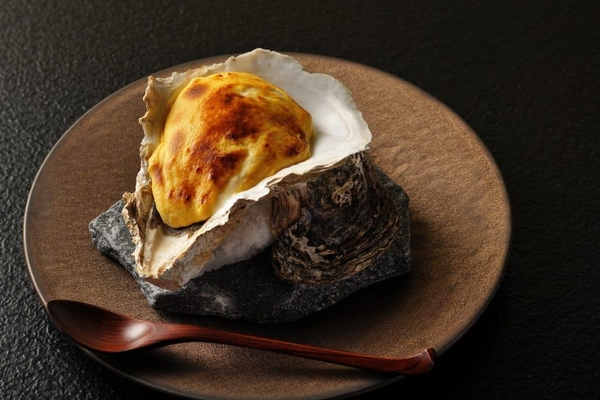 岩牡蠣のローストを牛フィレ肉で包み、酸味のあるベアルネーズソースのグラタンに仕立てた一皿です。この料理は、フランス料理の定番である岩牡蠣と仔牛の組み合わせに着想を得ました。3年熟成させ、塩味や磯の香りの角が取れまろやかになったオイスターソースで絡めた岩牡蠣のクリーミーな旨味と、牛フィレ肉のもつ上質で繊細な脂分の甘みは相性ぴったりです。