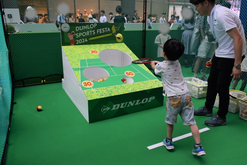 テニスラケットとレッドボール※を使用し、3球球入れするコンテンツ。50点以上獲得した方にはミニチュアボールをプレゼントしました。