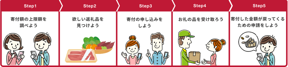 最初は手続きが難しそうでハードルを高く感じがちですが、5つのステップで簡単に「ふるさと納税」を行うことができます。