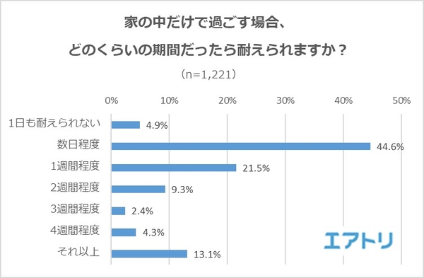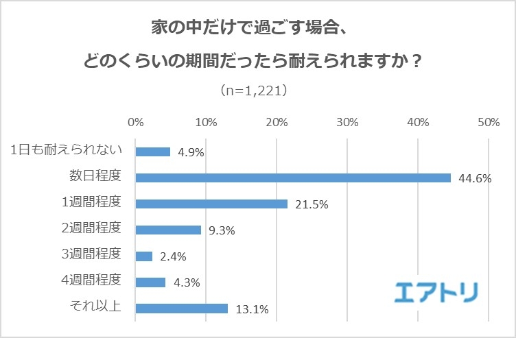 最も多かった回答が「数日程度」(44.6%)となり、「1日も耐えられない」(4.9%)と合わせると約半数が1週間は辛いと考えていることが分かりました。