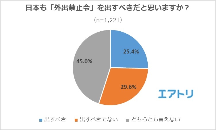 イタリア・スペインやインドなど各国で発令され、日本においてもその可能性が示唆されている「外出禁止令」ですが、「出すべき」は25.4%、「出すべきでない」は29.6%と意見が拮抗しました。また、最多回答は「どちらとも言えない」となっており、世間はまだ新型コロナに対する対策についてどうすべきなのか考えあぐねているようです。
