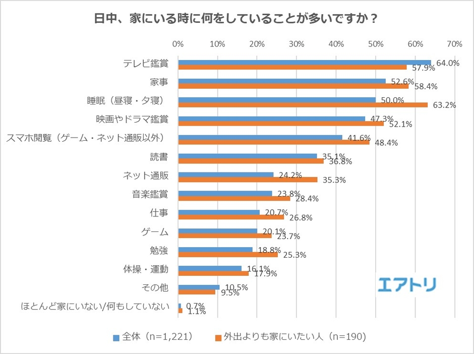 全体では「テレビ鑑賞」(64.0%)が最多となった一方で、「外出よりも家にいたい」と回答した人に対象を絞った場合の1位は「睡眠(昼寝・夕寝)」となり、「テレビ鑑賞」を選んだ割合だけが唯一全体よりも少なくなりました。多くの人がせっかくの休みだから何かをしなければ!と焦ってしまいがちな中で、「外出よりも家にいたい」と答えた人はその意識が他の人よりも希薄なように推察されます。