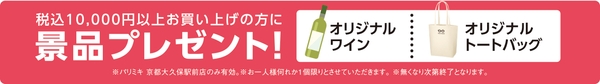 オープンを記念し、税込10,000円以上お買い上げの方に、パリミキオリジナル「トートバッグ」「ワイン」の何れか1つをプレゼント!