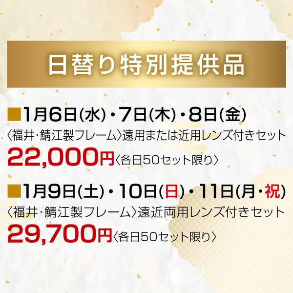 福井・鯖江製フレーム+レンズセットを各日限定50セット限りにてご用意いたします。メイド・イン・ジャパンならではの、日本人の顔立ちに合わせて設計された掛け心地の良さはもちろん、カラーやデザインにこだわってつくられています。