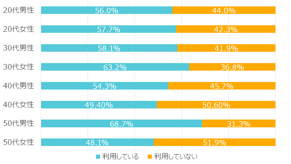 ご覧の通り、最も利用率が高かったのは「50代男性」で68.7%、最も利用率が低かったのは「40代女性」の49.4%という結果に。