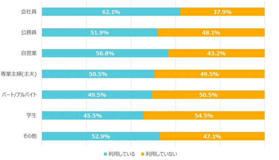 最も利用しているのは「会社員」で利用率は約62.1%、一方最も利用していないのは「学生」で利用率は45.5%という結果に。