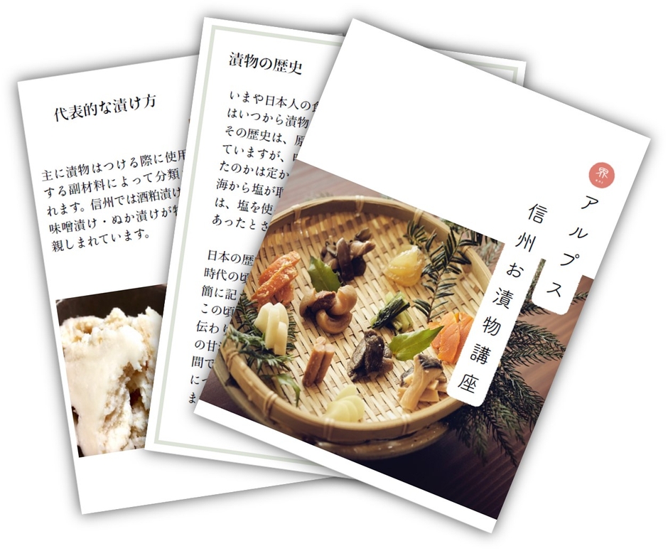 本プランでは、信州生まれ信州育ちの漬物屋のおばちゃん講師を迎え、「漬物塾」を開講します。漬物の歴史や信州の漬物の特徴についてまとめたオリジナルテキストを使って、信州の漬物文化について学びます。