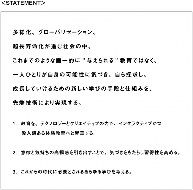 2020年に新学習指導要領での教育や大学入学共通テストが開始されるなど、未来を見据えた教育改革がスタートし、学校教育の現場にもアップデートが求められています。これまで1→10は、シンガポールの教育型エンターテインメント施設へのインタラクティブコンテンツの提供をはじめ、コクヨ株式会社の筆記量を可視化するIoT文具「しゅくだいやる気ペン」や、京都府助成金によるエデュテインメントコンテンツの開発への参画など、教育と娯楽を組み合わせた様々なエデュテイメントコンテンツを開発・制作して参りました。それらの実績をもとに、教育団体とのコラボレーションや産学連携を図り、学校や塾、教育関連メーカー、商業施設などで今後発生しうる教育課題にコミットしていきます。