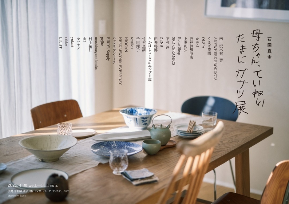 人気インフルエンサーの石岡真実さんが愛用する器やグラス、台所道具、食品、雑貨、装飾品、アパレルなどを集めた期間限定ポップアップ『母ちゃん、ていねい たまにガサツ展』。