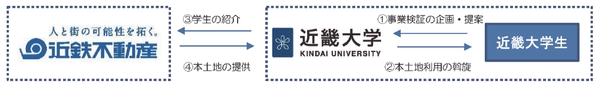 本取り組みは、近鉄不動産と近畿大学が協力して起業を志す学生を支援するもので、河内小阪駅前の土地活用方法を検討していた近鉄不動産と、学生の起業支援に利用できる場を模索していた近畿大学が、今般連携することとなりました。近畿大学が、起業を志す学生を募集して近鉄不動産に紹介し、近鉄不動産は当該学生が企画した事業の検証の場として本土地を提供します。