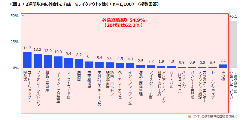 20代における外食率が高く、一人暮らしにより、外食機会の多い様子が窺える。「居酒屋」は8.2%と全体の6位にとどまった。<図1>