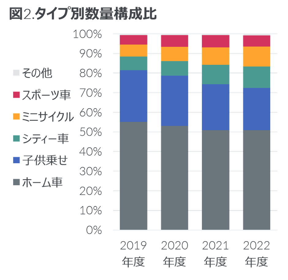 電動アシスト自転車で数量構成比51%を占めるホーム車1は数量前年比1%増とほぼ前年並みであった(図2)。次いで販売が多い子供乗せ2は数量前年比6%減と低調で、数量構成比では22%となった。出生数が減少していることもあり、子供乗せの減少トレンドは今後も続くと考えられる。