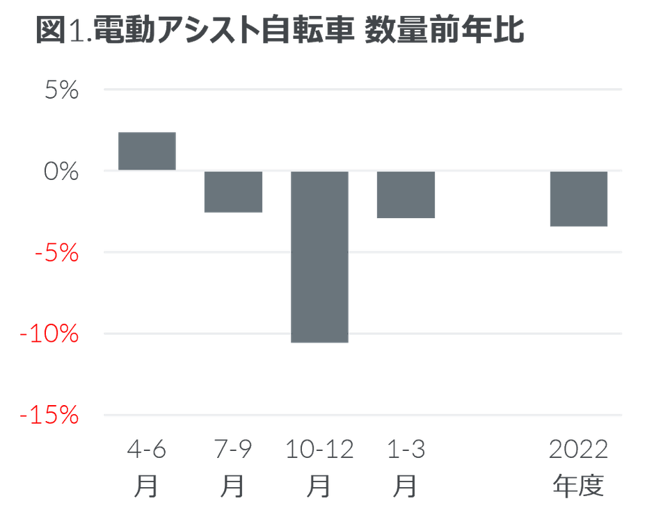 2022年度の電動アシスト自転車販売は、数量前年比3%減と微減であった(図1)。4-6月は同2%増と前年を上回ったものの、為替の変動や原材料高騰のあおりを受け、6月から相次いで価格改定が実施されたことで、7-9月以降はマイナス成長に転じた。特に10-12月期では数量前年比11%減と大幅な減少が見られた。