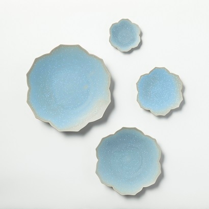 シンプルに図形化する「家紋」など古来の文様から着想を得て、花の輪郭を象った器。京都・清水焼の作家・工房の技術でつくられる繊細かつ実用的な器です。