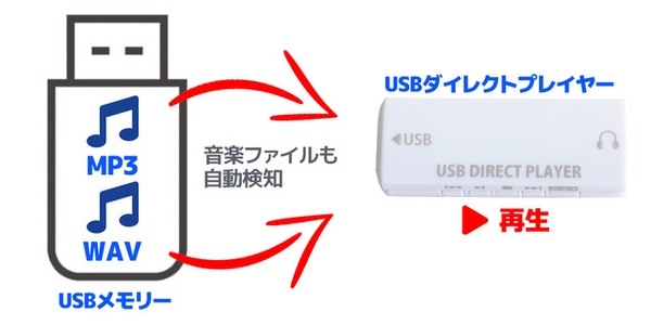 USBダイレクトプレイヤーは接続されたメモリー機器内部を自動的に検索してmp3やWAVファイルの音楽ファイルを検出して再生を可能にします。お手元のメモリー機器をmp3プレイヤーに早変わりさせるアイテムです。