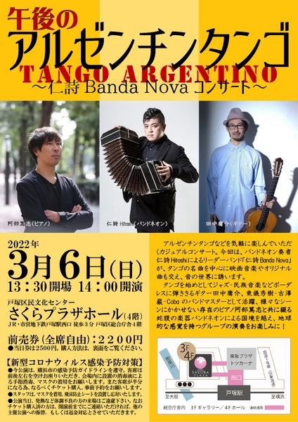 ヒラルディージョ事務局(神奈川県横浜市)主催、~仁詩 Banda Nova コンサート~『午後のアルゼンチンタンゴ』が2022年3月6日 (日)に横浜市戸塚区民文化センター さくらプラザ・ホール(神奈川県横浜市)にて開催されます。チケットはカンフェティ(運営:ロングランプランニング株式会社、東京都新宿区、代表取締役:榑松 大剛)にて発売中です。