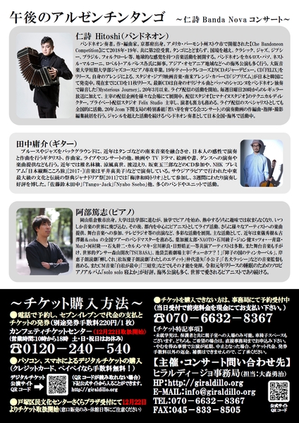 バンドネオン: 仁詩Hitoshi / ギター: 田中庸介 / ピアノ: 阿部篤志