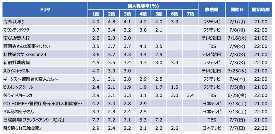 夏ドラマ14番組のそれぞれの個人視聴率は、各話以下の通りとなっています。