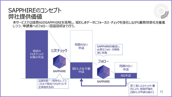 SAPPHIREは、現在、経理担当者が目検で行っている経費チェックをAIが代替することで、効率化・自動化を推進します。入退館や勤怠データなどを組み合わせて複数データから多面的にチェックし、リスクの高い申請を洗い出します。