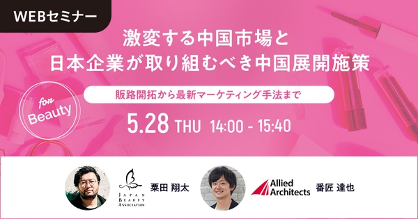 ソーシャルテクノロジーによる生活者マーケティングの実現を支援するアライドアーキテクツ株式会社(東京都渋谷区、代表取締役CEO:中村壮秀、証券コード:6081)は、化粧品ブランドの中国進出をサポートする一般社団法人日本美粧協会(本社所在地:東京都中央区 代表理事:郑 文杰 以下、JBA)と、中国向けビジネスをご検討中の化粧品企業様、美容系広告主企業様を対象に、中国展開にあたり理解しておくべき中国市場動向や展開手法といった基本的な情報から、最新マーケティング手法、日本企業の取り組み事例まで、中国展開における成功のための秘訣を解説するセミナーを5月28日(木)に開催いたします。