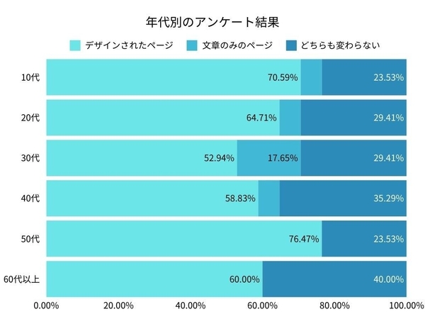デザインされたページの支持率は52.94%で、「どちらも変わらない」と答えた層も29.41%に達しました。 この年代では、デザインだけでなく、コンテンツの信頼性や実用性を重視する傾向が強いことが分かります。