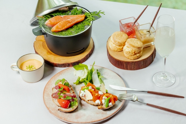 プライベート空間で楽しむのは、専属のワイルドライフ好きなシェフと一緒に作るブランチです。アウトドア器具を使いながら、桃の果実だけでなく、枝や花、葉を含めた桃を存分に味わえる料理を用意します。みずみずしい白桃の香りの紅茶や、桃の木をチップに使ってスモーカーで燻製したサーモンをのせたオープンサンド、桃の花のコンフィチュールと一緒に味わうスコーンなどを楽しめます。アウトドアでの調理法を熟知した専属シェフがつくため、初心者の方でも安心して調理体験ができます。