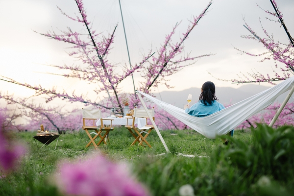 花見の舞台は、笛吹市の桃農園です。普段は一般開放していない桃農園を本プラン限定で貸し切ります。テーブルやチェア、ハンモック、焚き火を設えた特別席で桃の花見を楽しみます。桃の花と、遠くに広がる南アルプスをはじめとする残雪を頂いた山々の景色は、この時期ならではの絶景です。眺めだけではなく、杏仁のようなほのかに甘い香りも楽しめます。ハンモックや焚き火を楽しみながら、桃農園での優雅なひとときを過ごします。