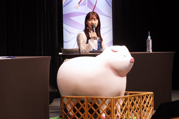 SNSで一般募集を行った「豚のカメラ」コーナーを経て、イベントはいよいよ今回のメインイベントとなるクイズコーナー「クイズブタオネア」の時間へ。ラジオ番組内でのコーナー「豚の気持ちを理解しろ」にて、松岡さんの豚の鳴き声の台詞の、日本語の意味を当てる、という深層心理を探るコーナーで、レギュラー放送内では、常に連戦連勝をしてきた楠木さん。賞品をかけて本日最後の戦いに臨みます。松岡さんの見事な豚の鳴き声に苦戦をしながらも、会場からのオーディエンス等のフォローもあり、見事に全問正解を達成。見事豚のお菓子、4ケースを獲得することができ、会場は大きな拍手に包まれました。