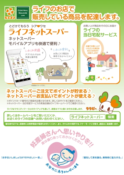 “ライフ×マタニティマーク”が都営大江戸線1編成車両に登場! 妊産婦さんもネットスーパーや当日宅配サービスで 手軽にお買い物ができる!