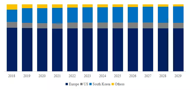 生産地別に見ると、半導体前駆体の主な生産地は現在、欧州(主にドイツとフランス)、韓国、米国、日本に分布している。中でも欧州のシェアが高く、メルク社とエア・リキード社の大手2社で世界シェアの60%以上を占めている。