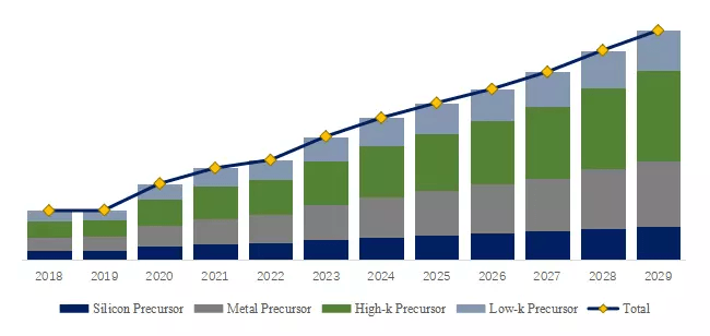 製品の種類から見ると、現在のプリカーサには主にシリコンプリカーサ、メタルプリカーサ、High-kプリカーサ、Low-kプリカーサがある。異なるプリカーサの主な応用場面は異なり、その安定性と信頼性も異なる。その中で、High-kプリカーサは最も重要なセグメント製品であり、約35%を占める。High-Kプリカーサー製品は、熱安定性が良く、プロセスの信頼性が高く、揮発性が強いという特徴がある。この製品は主に45nm以下の半導体製造プロセスで使用される。