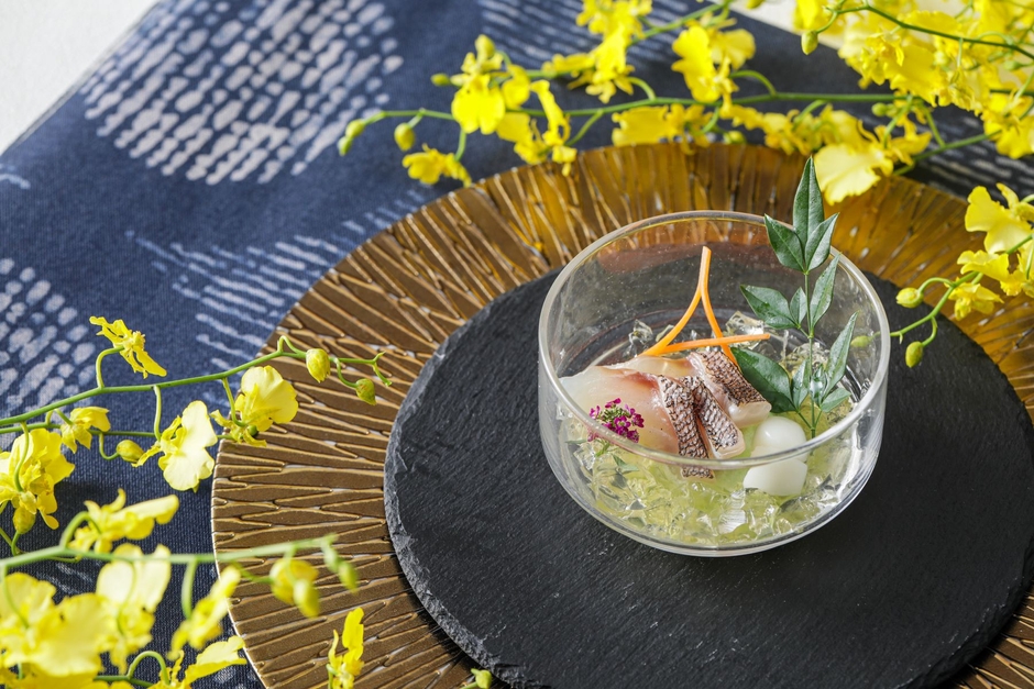 世界有数の漁場を持つ本州最北端の青森県からは、津軽海峡の荒海で育った「ノドグロ」を使用した、“青森県産ノドグロのマリネジュレのアクセント”を冷前菜にお楽しみ頂きます。秋田県からは、エビとは思えないほどの巨大な大きさが特徴のシータイガーの異名を持つ「皇帝海老」をグリルした“秋田県産 皇帝海老のグリル油淋鶏ソース添え”、岩手県からは三陸の豊かな自然が育んだ至宝「蝦夷鮑」を贅沢に使った“岩手県産蝦夷鮑のソテー ソースブルギニョン”をご用意いたしました。